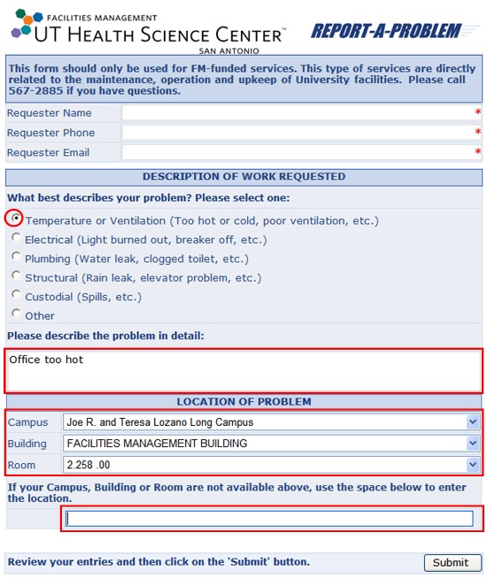 When calling please be specific as to the location or space that is uncomfortable. Provide a departmental contact who is familiar with the problem and other conditions of the location.
