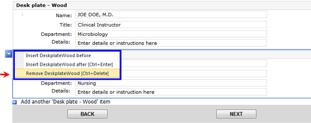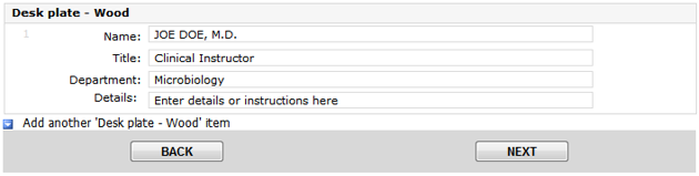 In the example below, entries have been made for a 'Desk plate - Wood' item. To make an additional entry, click on the 'Add another 'Desk plate - Wood' item' link (blue arrow).