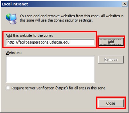 - In the 'Add this website to the zone:' field, enter: http://facilitiesoperations.uthscsa.edu