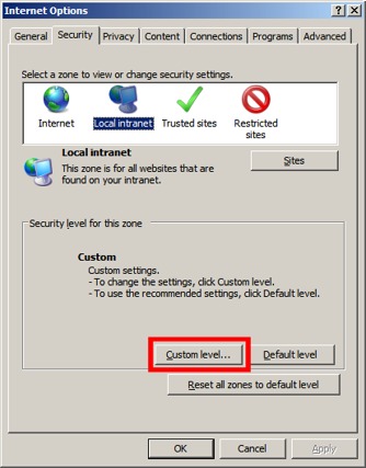 6. You will be taken back to the 'Internet Options' dialog. This time, click the 'Custom Level ' button. You will be taken to the 'Security Settings' screen.