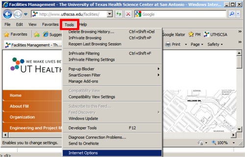 1. With Internet Explorer open, on the top toolbar click on Tools >> Internet Options