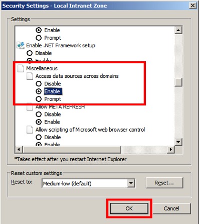 7. In the 'Security Settings' screen, scroll down the list of settings until you reach the 'Miscellaneous' category of settings. The first setting, "Access data sources across domains", should be set to 'Enable'. Then click the 'OK' button below.