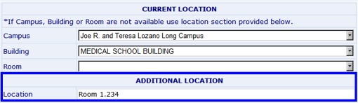 | In every place in the form that asks for the Campus, Building and Room, there is a section right below it that allows you to enter the exact location of the work you are requesting if that location is not selectable from the lists. For example, if Room 1.234 is not listed among the rooms for the Medical School building, simply type in "Room 1.234" in the additional location section. If the location where the work is being requested is not a room but rather a general area such as a "parking lot" or "lobby", you may type as such in the Additional Location section as well.