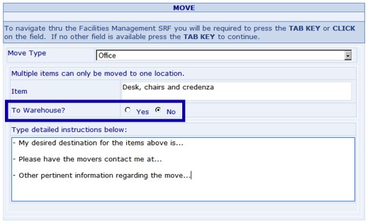 Most of the moves performed by FM involve the relocation of items to the HSC warehouse. In cases where the destination of the items is not the HSC warehouse, you can indicate that on the form by selecting the proper option button as shown below. Be sure to include any instructions that you want our movers to know prior to the move. ![]() |