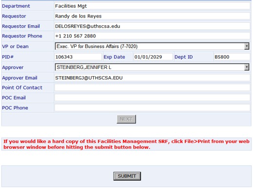 | You may print the form right after you have filled out the 'Department Information' section and right before you click on the 'Submit' button.